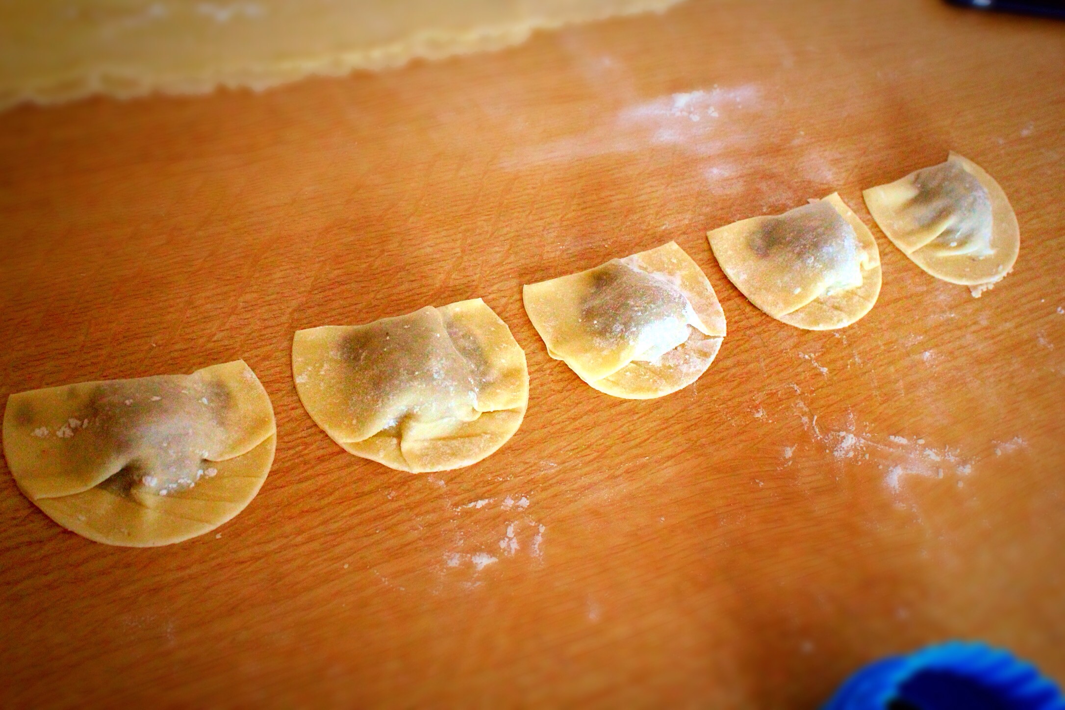 Folding the pasta over (after brushing the end with egg of course) I made sure there were no air pockets within the shape. (At first there was, as its one piece of pasta, you squeeze air out of one and it goes straight into its neighbour, (fucking science)). Once I reflected my method (third sheet) I realised it’s easier if you just fold it over and squeeze one at a time then cut it with a biscuit cutter. Then move onto the next one.