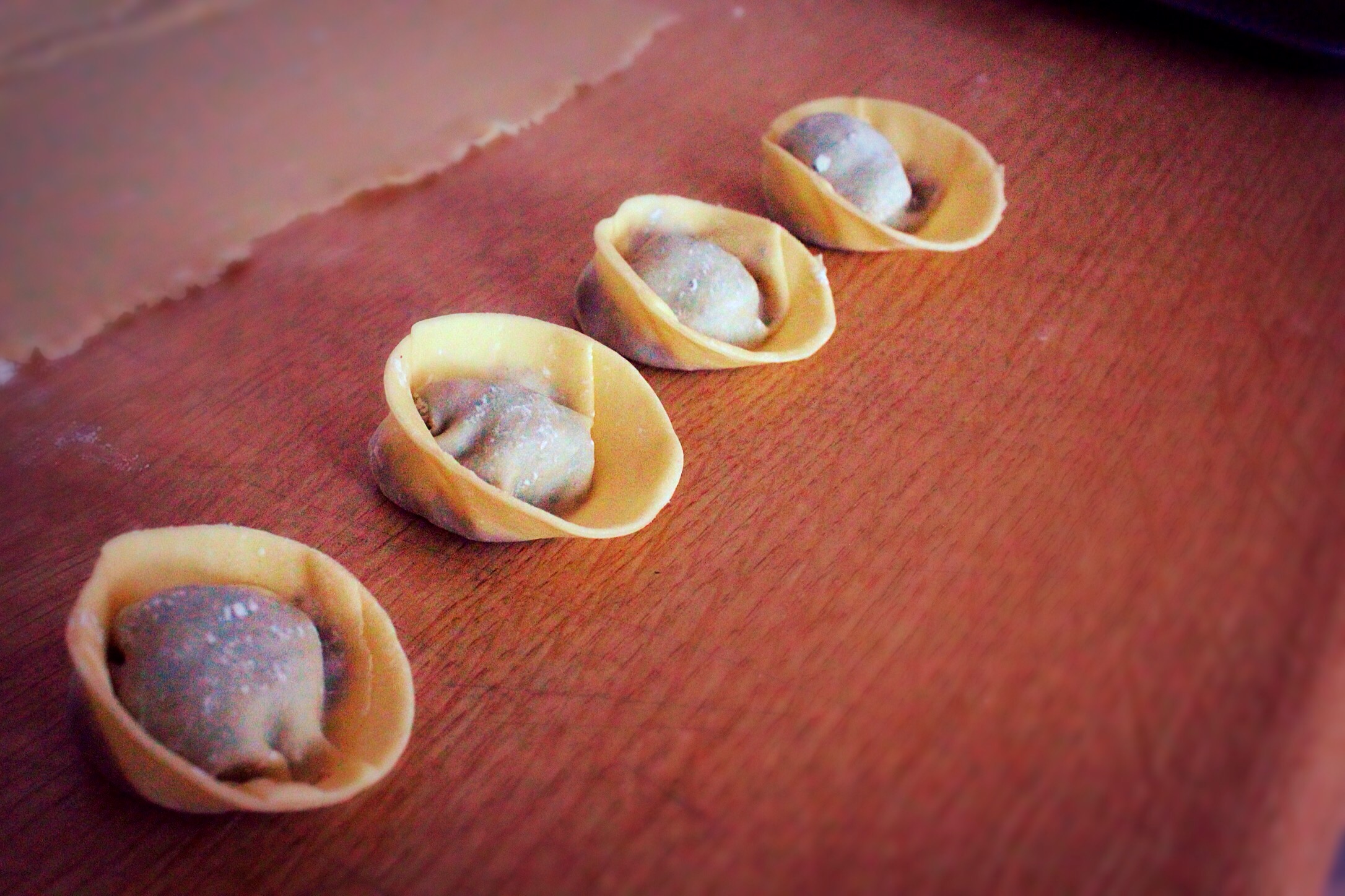 Now shape the buggers, pull up the outsides and give the back a little squeeze together. They WILL stay together. Now you have tortellini! (Again when you put them on a plate before cooking……PUT SOME FLOUR on it. I damaged three of them at this stage.