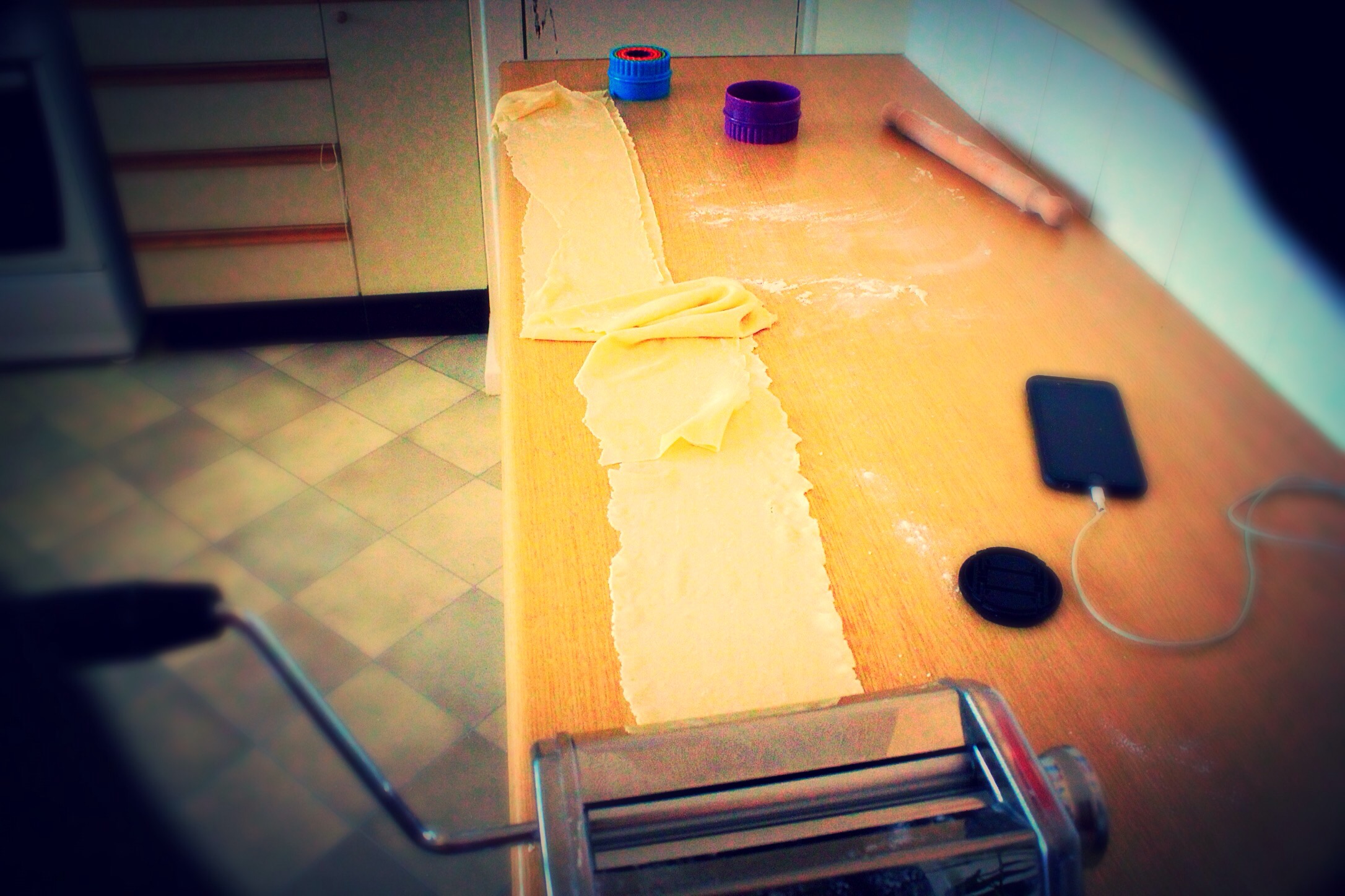 Pasta rolling on the machine starting with number one, then two then three then… Well you get the idea. On eight you put the end of the ribbon back into the machine to connect to the other end giving it a fan belt look as you spin the handle. Two more thickness (or thinness) settings and the pasta was getting a little long. Starting to worry I was going to run out of bench, I decided to quit while I was ahead. I think I had enough sheets, if I had too many, I could make a lasagne another time. Cutting it down to size (big enough to take four or five spoonfuls of filling) I started to fill the little pillows.