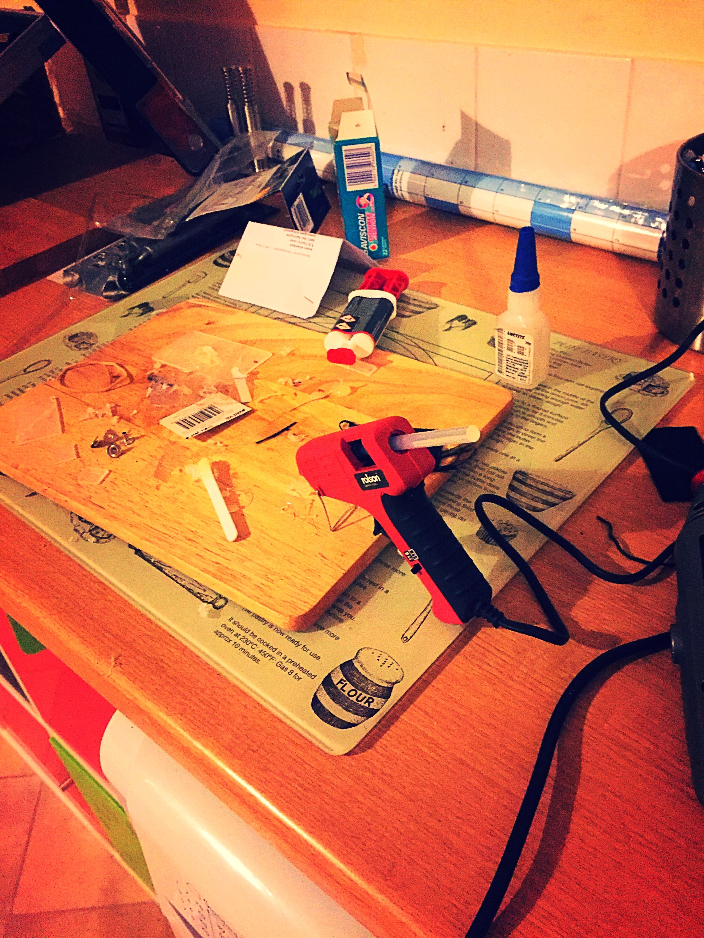Quick drying ‘superglue’ was avoided as it would end up with me in A&E affixed to a friggin bit of white plastic (or me table). So I went with araldite! I was told it was great stuff, I was told it had a curing time long enough to move if I positioned stuff wrong. I was lied to. It’s shite! I would have had better results with a friggin Prit stick, or sticky back plastic. My next choice was a glue gun 😳