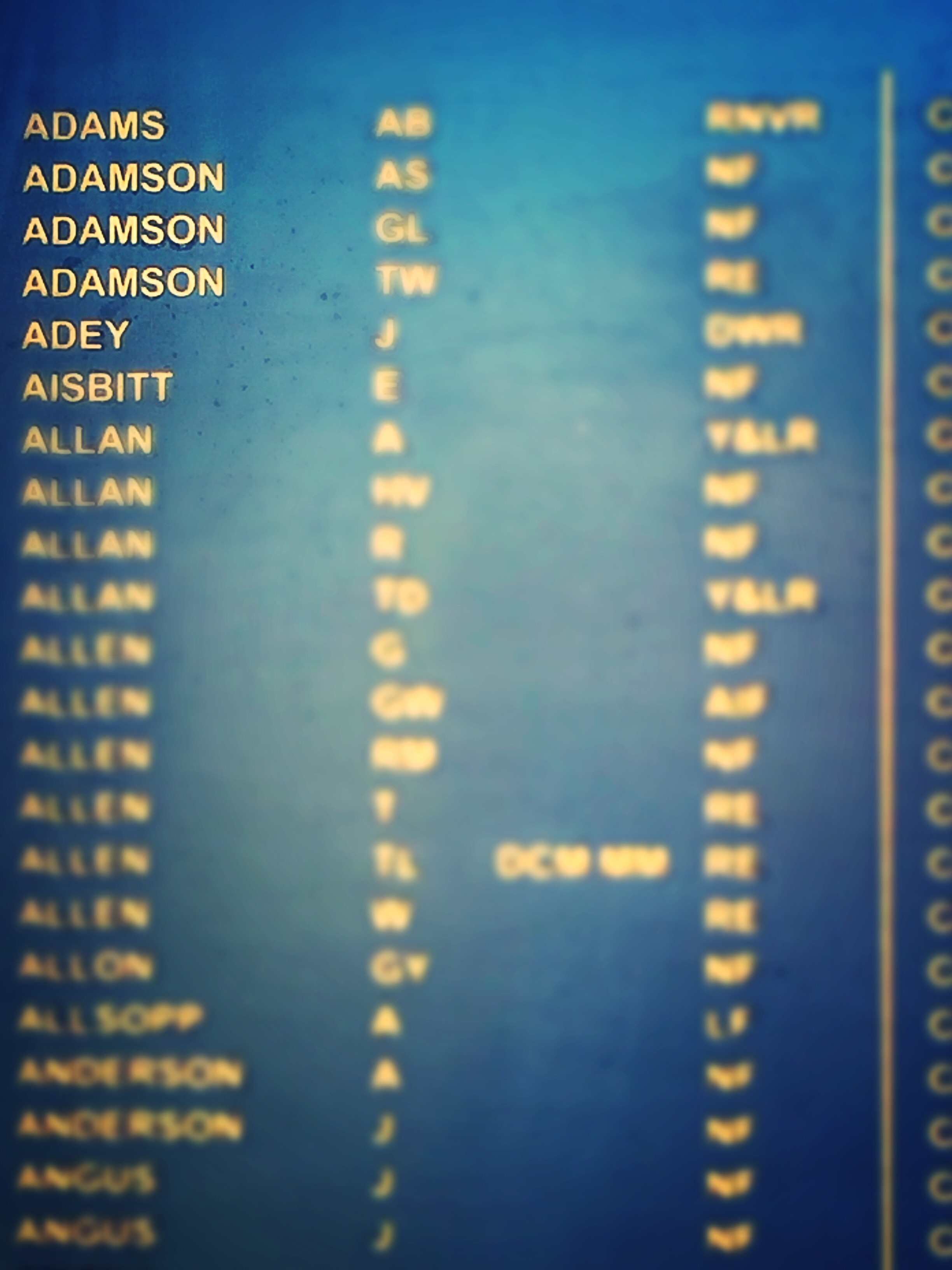 As I walked around admiring the love that went into it,(and the memories it evokes) I started reading the inscriptions! Both the Great War and the Second World War are commemorated and I surprised meself by finding THREE of my family on that stone! You’ll see below they were all part for the Northumberland Fusiliers (I think) and I gave myself the task of reseaching these fallen brethren. Their stories will get published in the future. I really didn’t think about my family and the wars (even though I’ve played in three myself). That’s the first incarnation of the title.