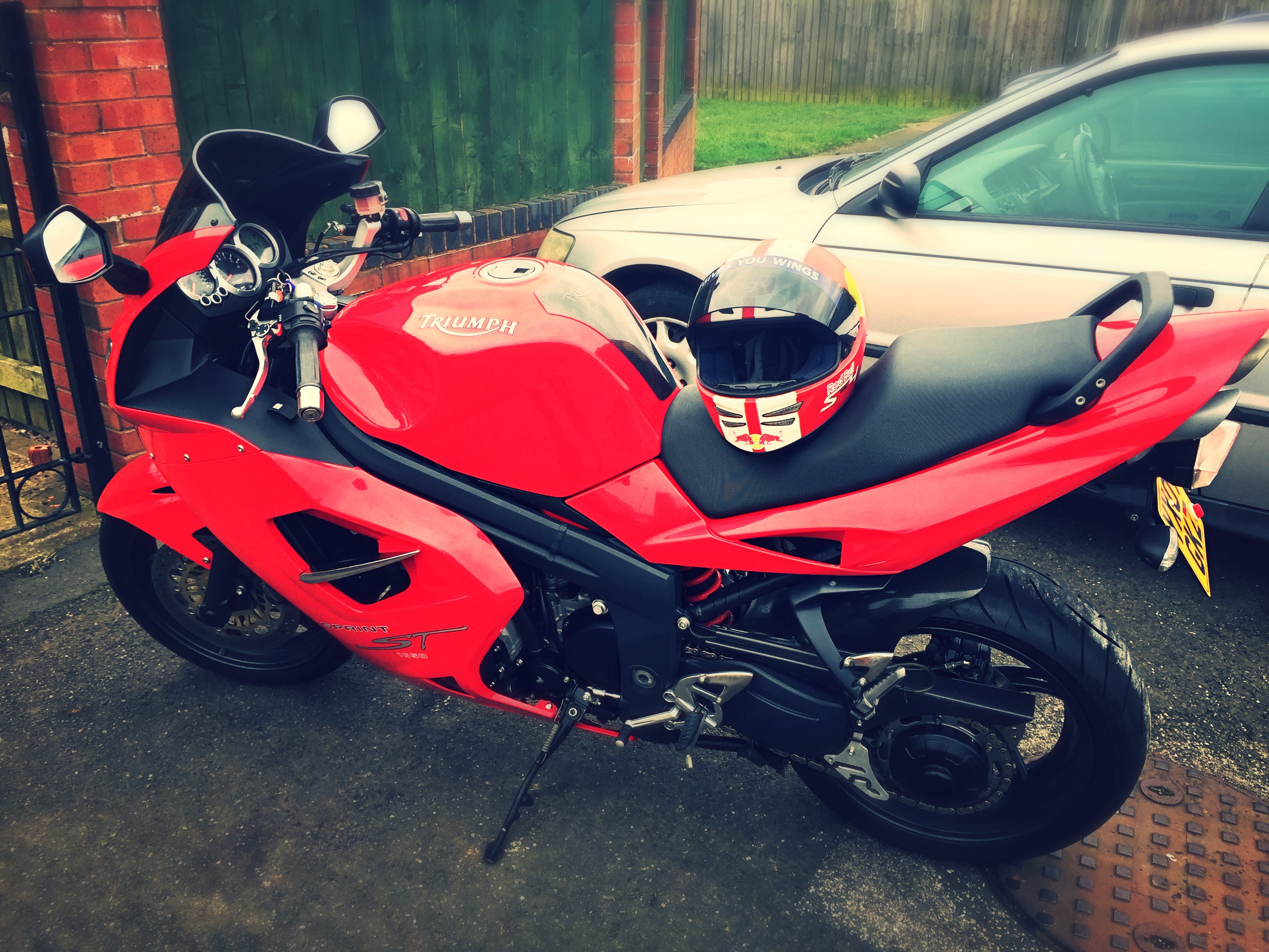 Bit pissed off this morning getting him out me shed! It transpired that when I applied the steering lock last night, the handlebar yolk dug into the composite tank taking a lump of paint off! I shall rectify this problem as soon as I scoff this sarnie with a trip to the bike shop to see what they have in stock! (But then again I did give them a bike with a questionable fuel gauge) swings and roundabouts it is.