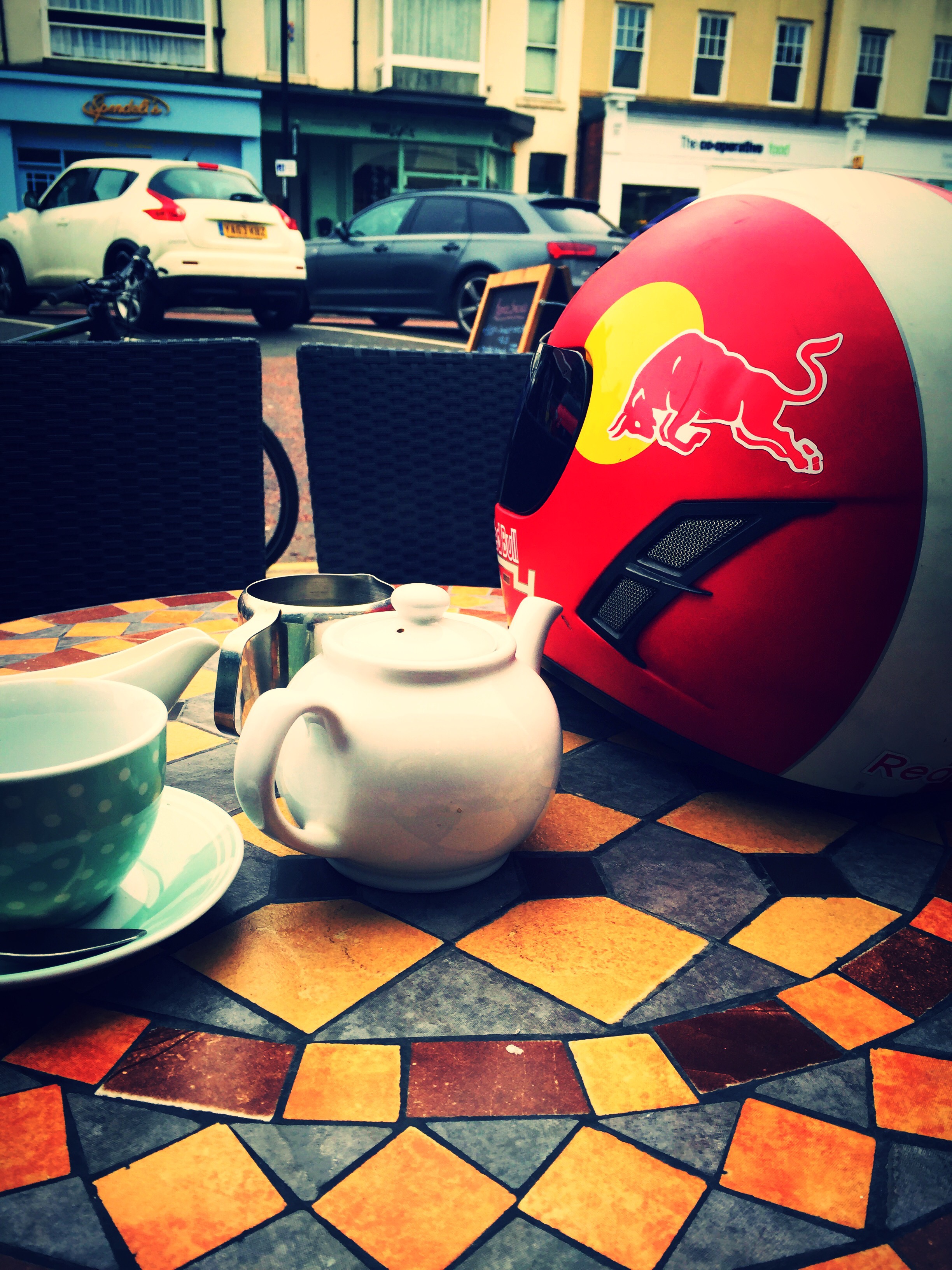Saturday! Morning! Cold! Spring? You’re having a laugh! What happened to the heatwave I was promised? What happened to the warm front coming in from somewhere or other! I’m freezing me Nads off having a cup of tea and bacon sandwich outside a small cafe in Tynemouth. (I could go inside but I’m looking at my pretty bike)