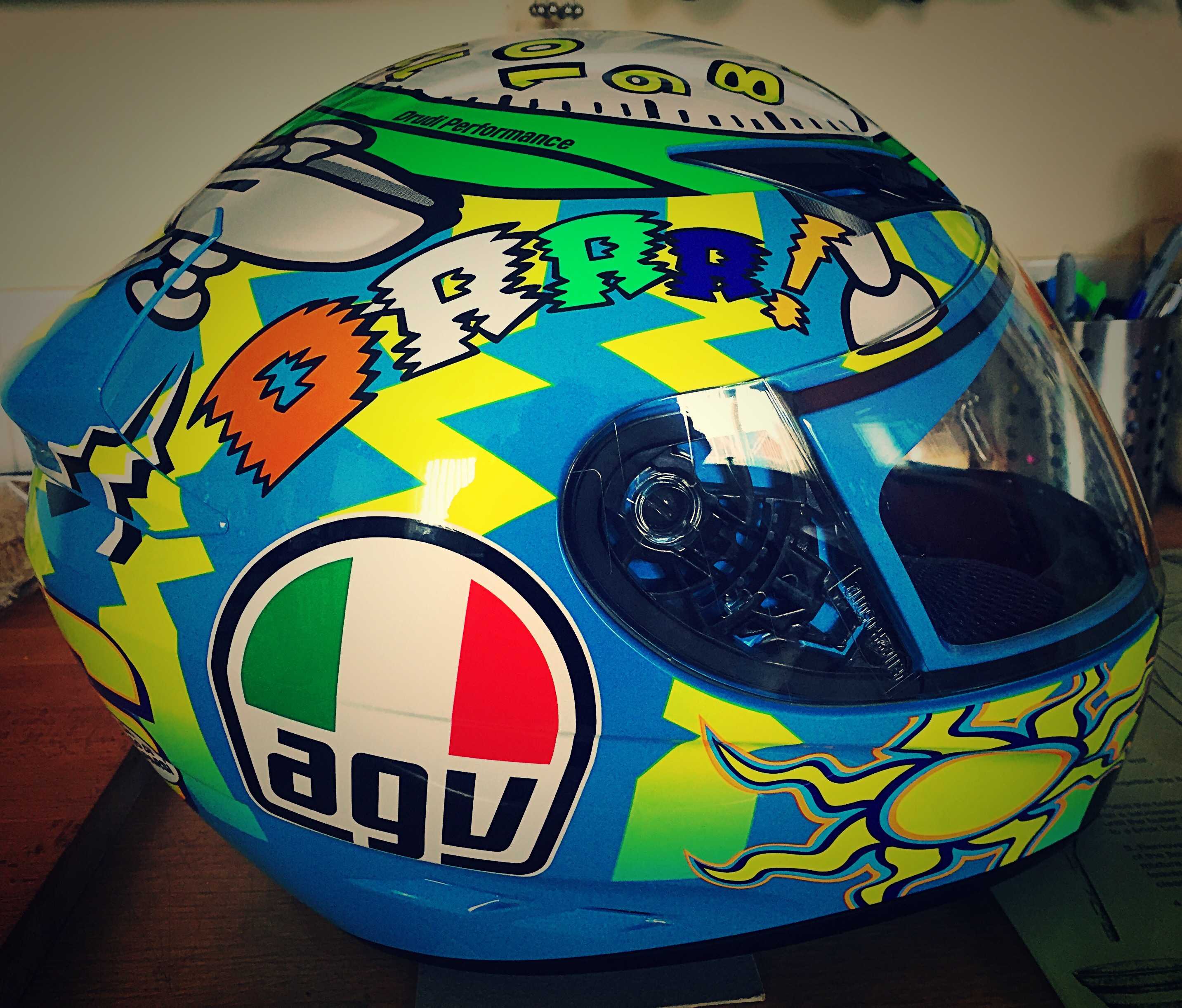 After many many hours trawling the interweb, I finally found my new ski slid! At first I was going to go for a lovely yellow and black ‘Guy Martin’ one, but when I spied this ‘Rossi Wake Up’ style, well I needed it achingly! The only problem? Just about EVWRYWHERE was sold out of the Medium size! Even my ‘go to’ web shop, Sportsbike.com originally said it would take up to six weeks to get them in! As it happens, after 24hrs searching eBay, Amazon, ukhelmets, redtube (only a select few will know that last site) I went back to the first one and bit the bullet! But lo and behold, the fuckers had one hiding in a corner somewhere so I paid the cash (helluva discount) and now I have a totally uncoordinated helmet for the bike, with no where for my Bluetooth, and a shite clear visor (for now) but by fuck does it look cool? (I’ll still be getting the Guy Martin of course) women and shoes? Me and skidlids!