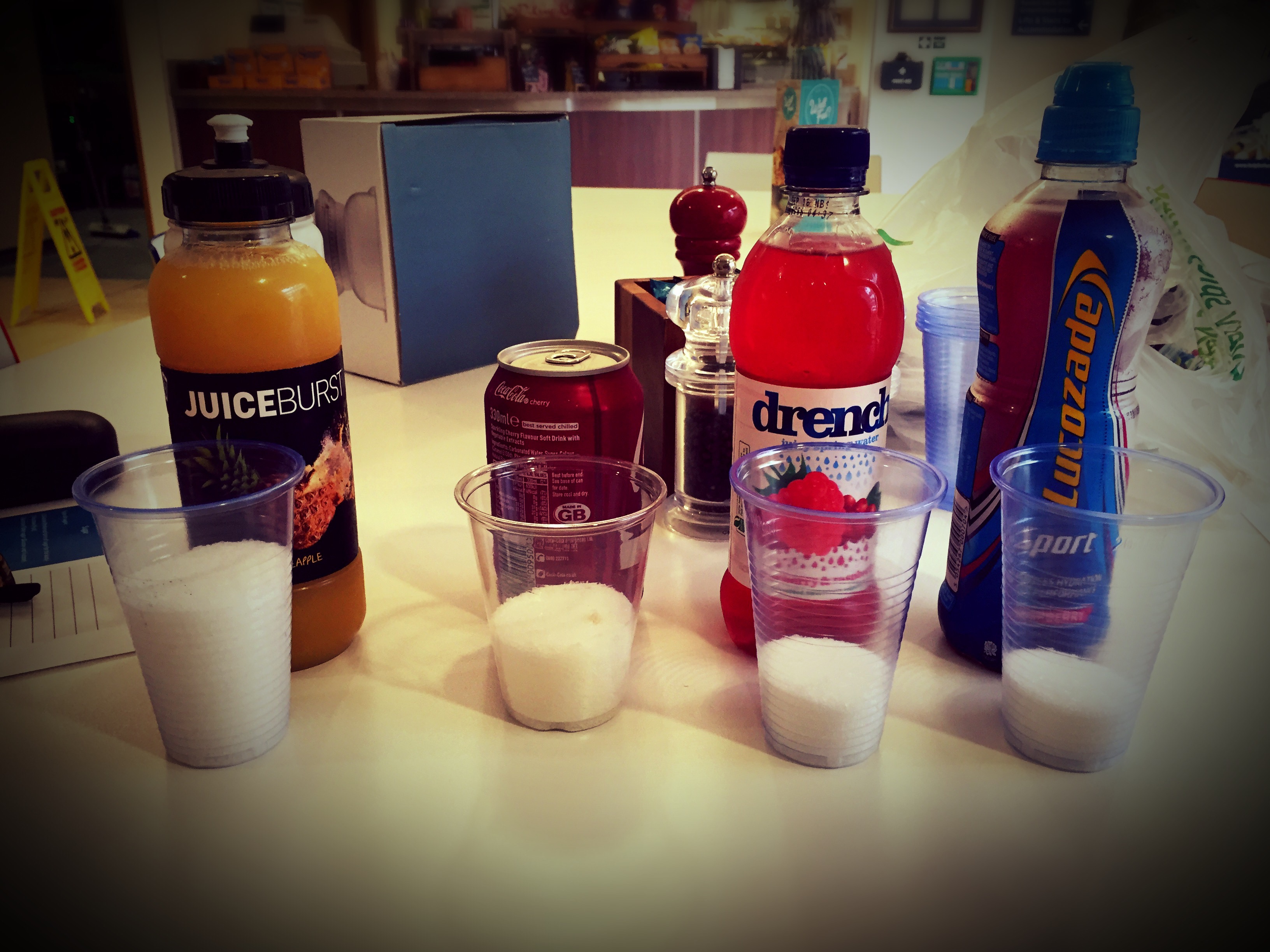 What DID get to me though, we went into the labelling on packages and nutritional values. Now if someone said ‘ooh there’s 146Kcal in that drink’, I wouldn’t have a fucking clue! So we decided to look at all the bumph on the labels and sort out the sugars! In front of each container is a beaker filled to however much bad sugar there is in each drink! Even the ‘Good’ drinks have way too much sugar in them. Checking websites for information, a teaspoon of sugar is about 4g in weight! So we just did the measurements and hey presto.