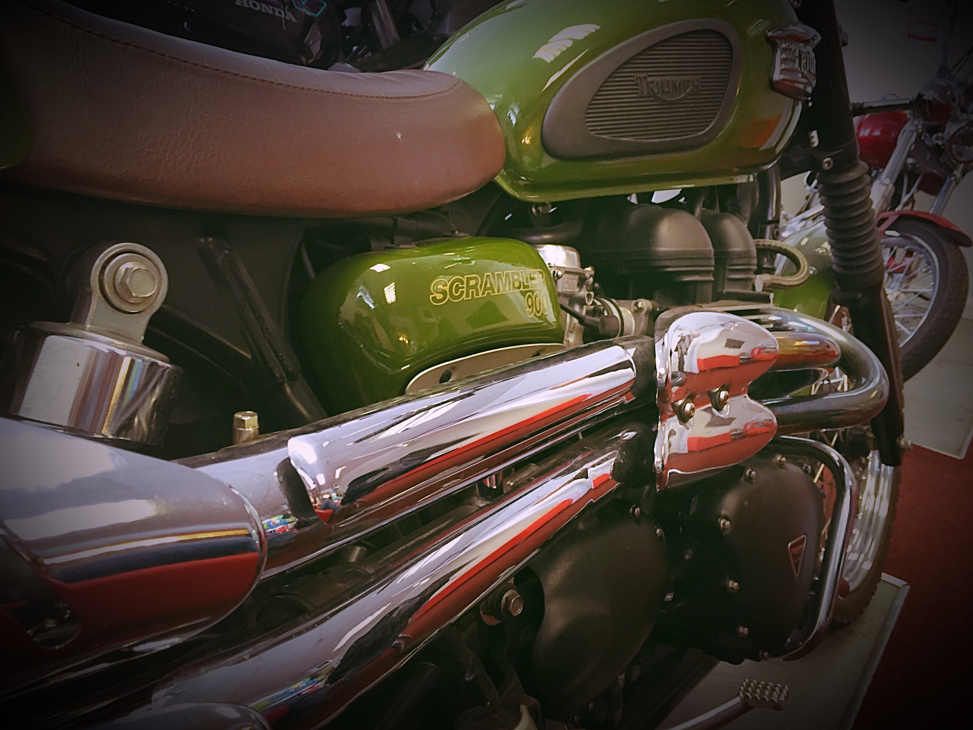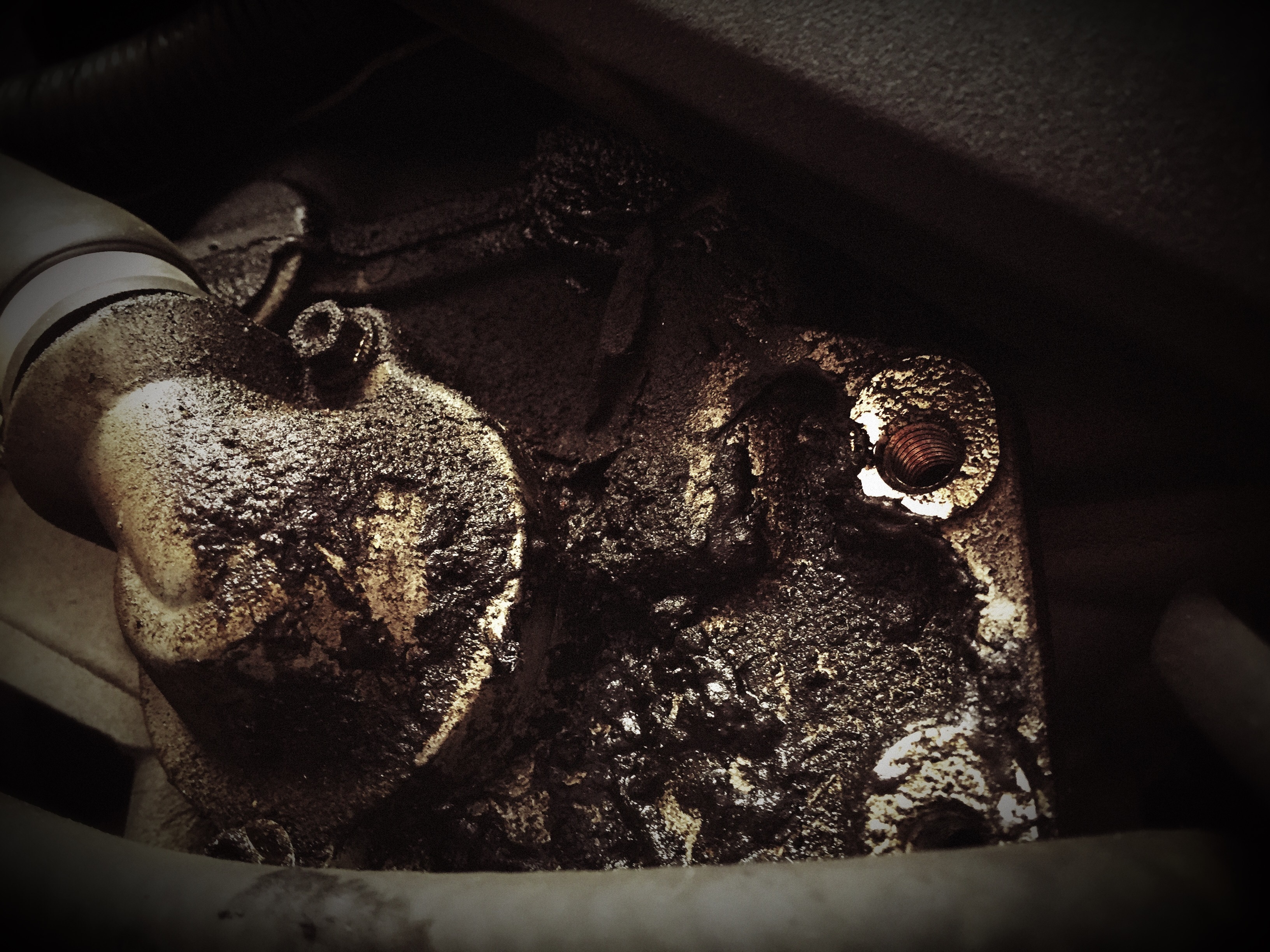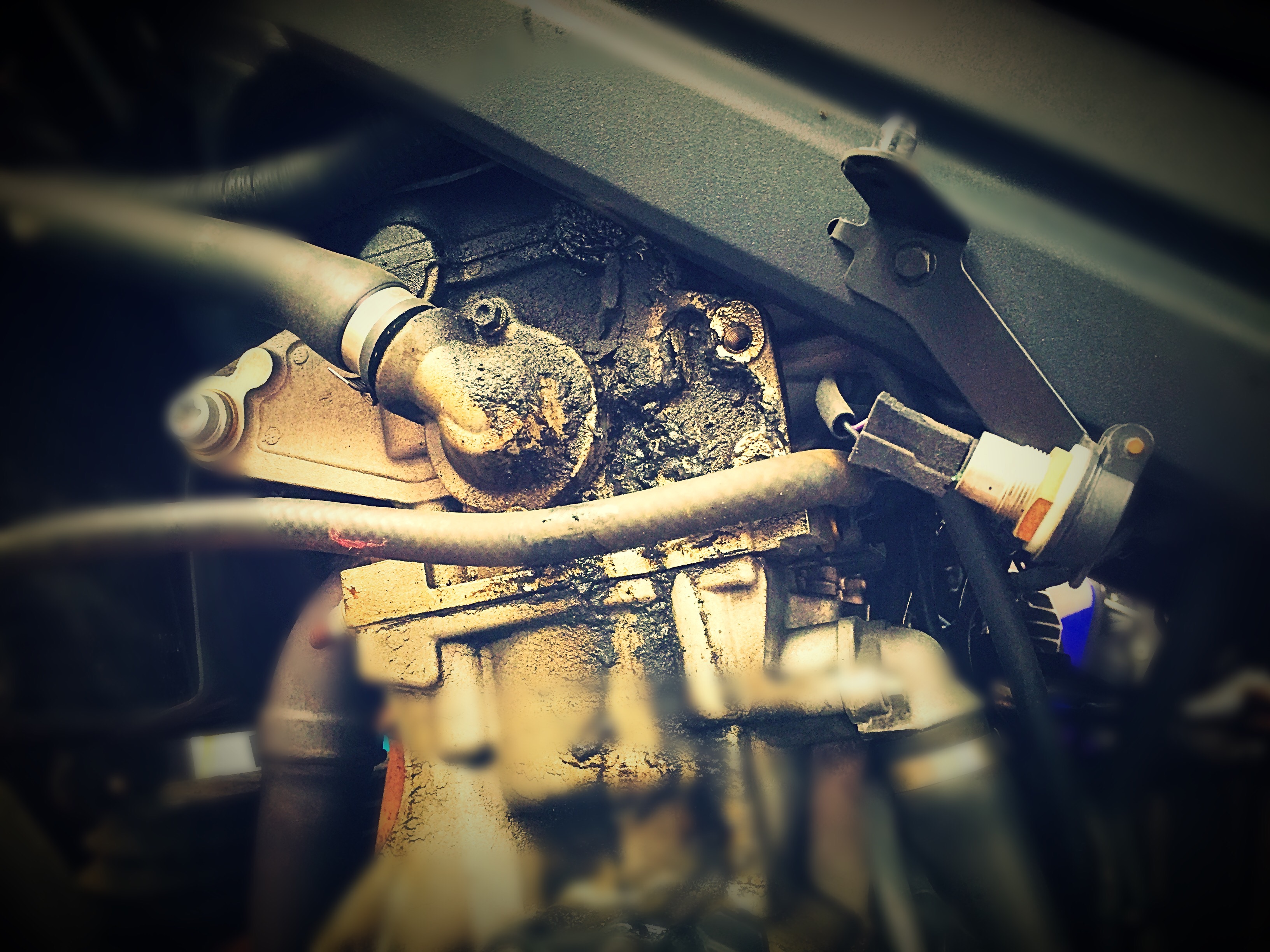 In terrible need of sustanence, I knew the perfect place to head towards. With my sliders safely stored in my ‘boot’ (I say boot, but it’s really a Cubby hole in me fairing) I shot off to morpeth for a coffee a bacon sarnie and I chat with the owner to see how long/ when and how much to fit. The answer, unexpectedly, was ‘about an hour,now, and the usual rate’, all good in my books, until I was asked to have a look at what they found when they removed my fairing 😕. It seems the oil leak that had been present when I bought the bike had not been as fixed as was sposed to be! Ah well, pics taken and phone calls made to get it booked in for NEXT Friday at Ian Bells, (he is coming home this week from the IOM and his funeral will be either this OR next week) but I was informed that the warranty work world still be honoured even if it’s lapsed a couple of weeks! (This shop STILL has its customers at its heart)