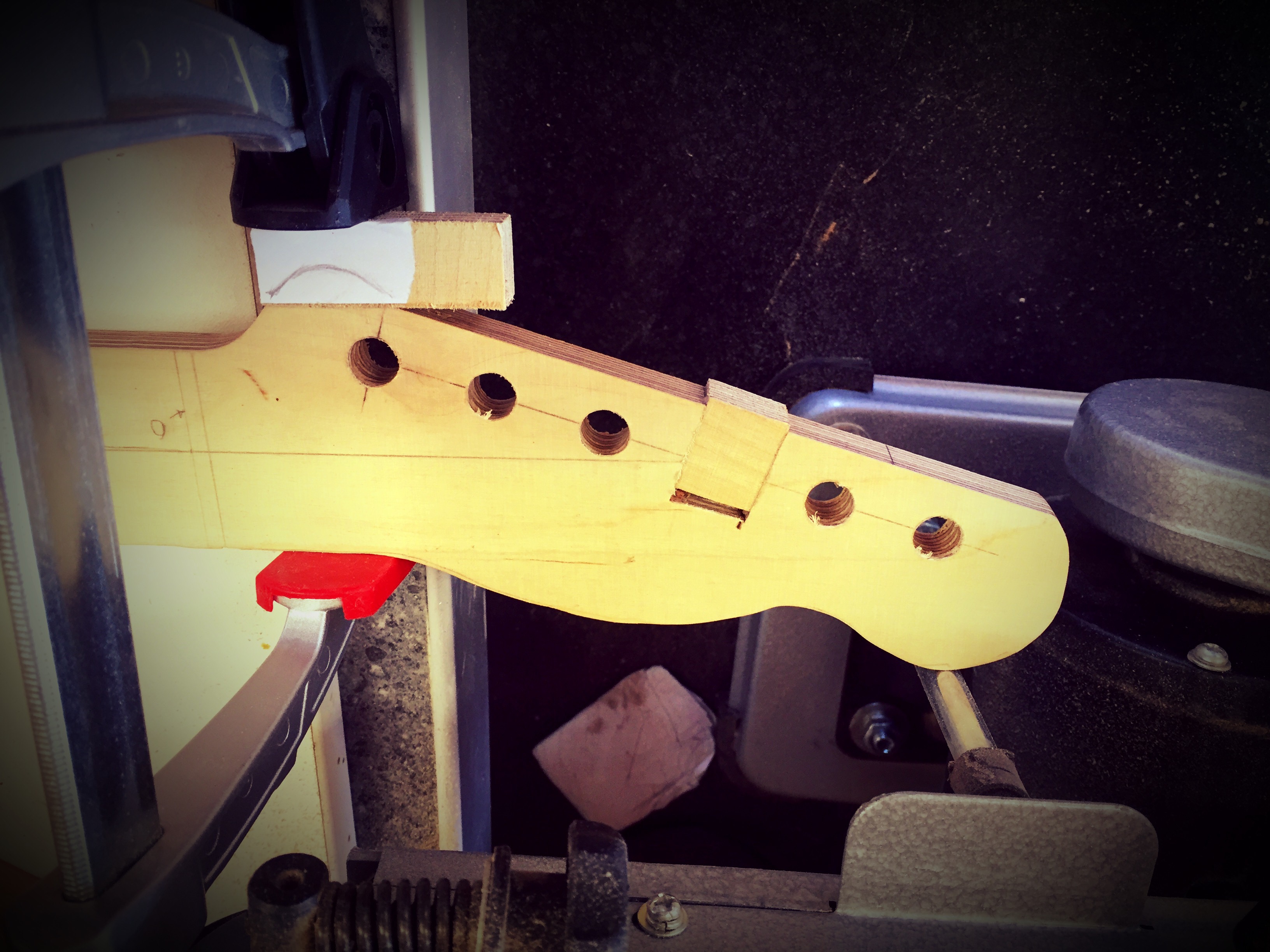 I was tasked to build a ‘jig’ for the others to use and everything was going well until Phil came in and looked at it with a civilians eye. An eye I wanted to stab him in within the next couple of minutes, so back to the band saw and chopping bits out to glue new stuff in. TWO places as you can see 🙄 just once I would like to get this woodworking thing right the first time.