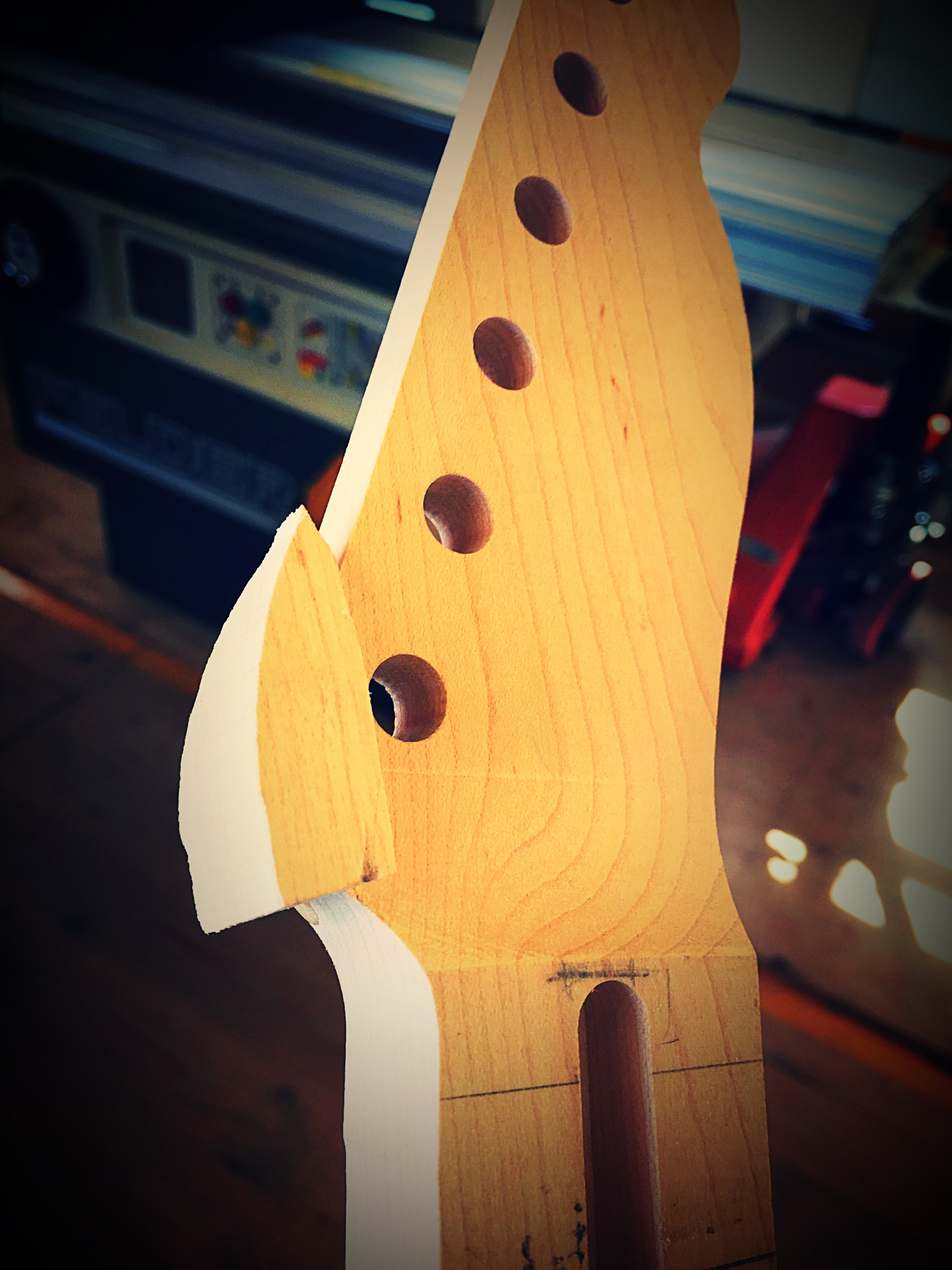 Anyhoo! Guitars, yep this six week course has been going on for about three months now (well it feels like it) honestly, I feel I’m growing my fucking Strat from the ground up!!! Yesterday we used the ‘routing’ bench. Fuck me, I would rather kiss a camel spider on its testicals than use that fucker again. I pride myself on being unflappable, but when this spinning blade of death ripped into the end of me neck wood, it took it out me hands and threw it across the workshop. I stood, mouth agog. Then I realised I just about shit meself. However, fixing the problems in making for myself seem to be second nature now and I’m becoming a dab hand with the glue and chisels!