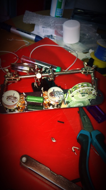 Three, yup count em, THREE wires coming off the both pickups! The diagram tells me I only have TWO, I smiled, then cried, then took a walk. A few texts and whatnot later, I had an idea. Another YouTube clip. This time the guy was a tad less chubby so I could see his fingers working properly. With ALL the wiring in place, it was time to stick it all in the body! ”Twas at this point I realised I had no idea how to do this, guess what! YouTube is a fucking miracle. Everything ‘soddered’ and screwed down, now all I needed was the neck