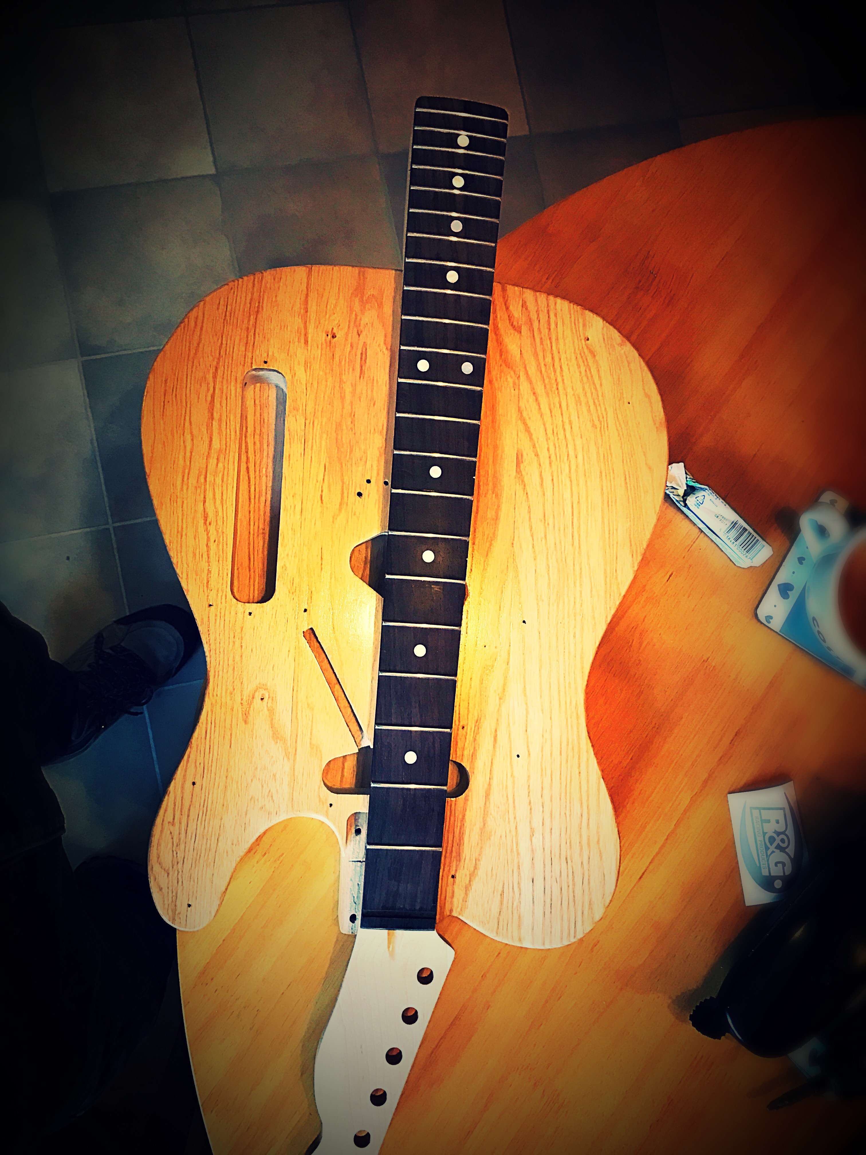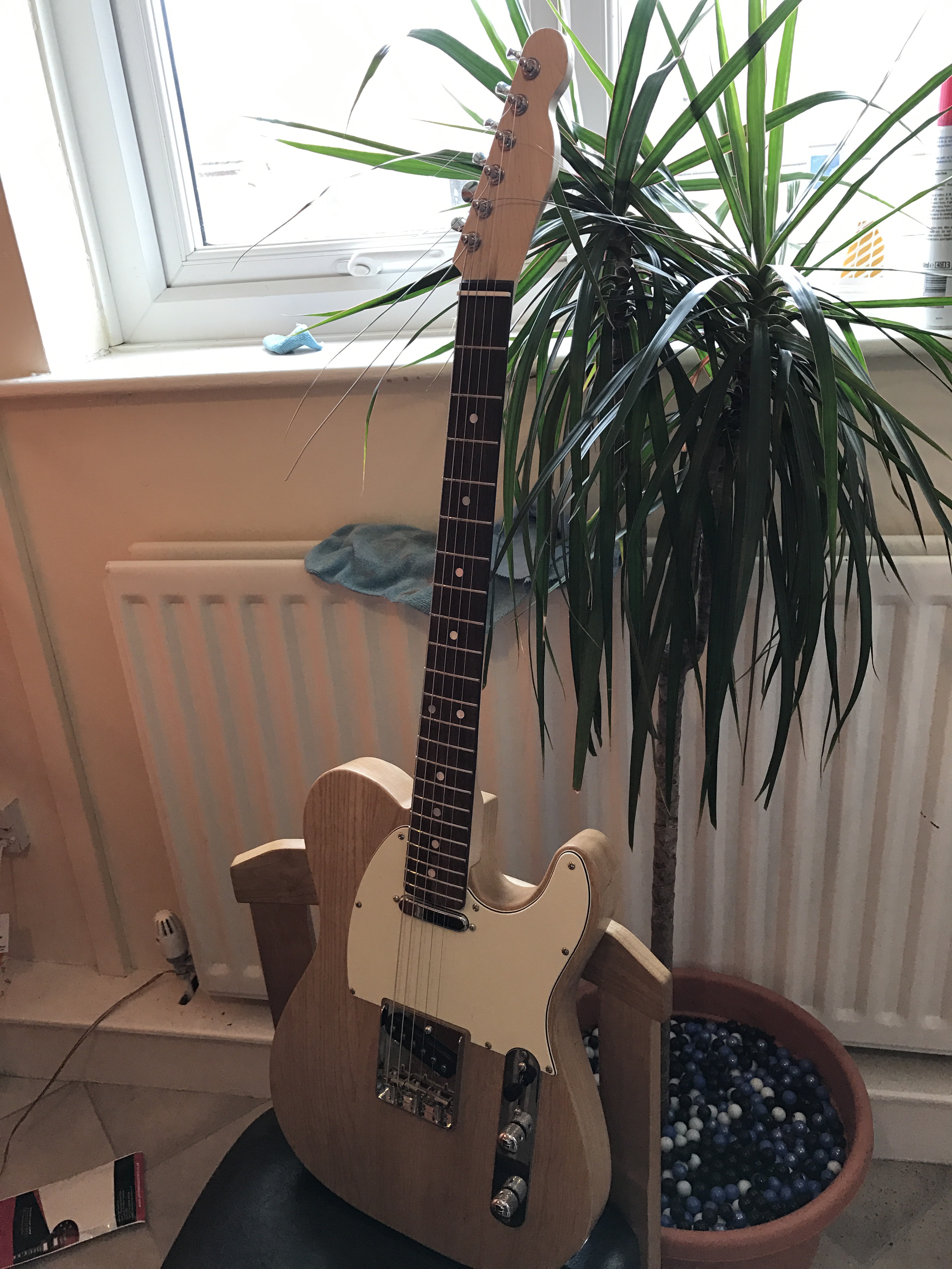 It’s done! She’s alive! She has ‘live’ running through her veins (well, strings) but the birth has finally happened. My gorgeous Telecaster that has taken nearly the length of time for the tree to grow from which it started off, but she’s worth it. I was at a loss of what to do today as my new central heating system was being installed so I thought I may as well give it a go!!