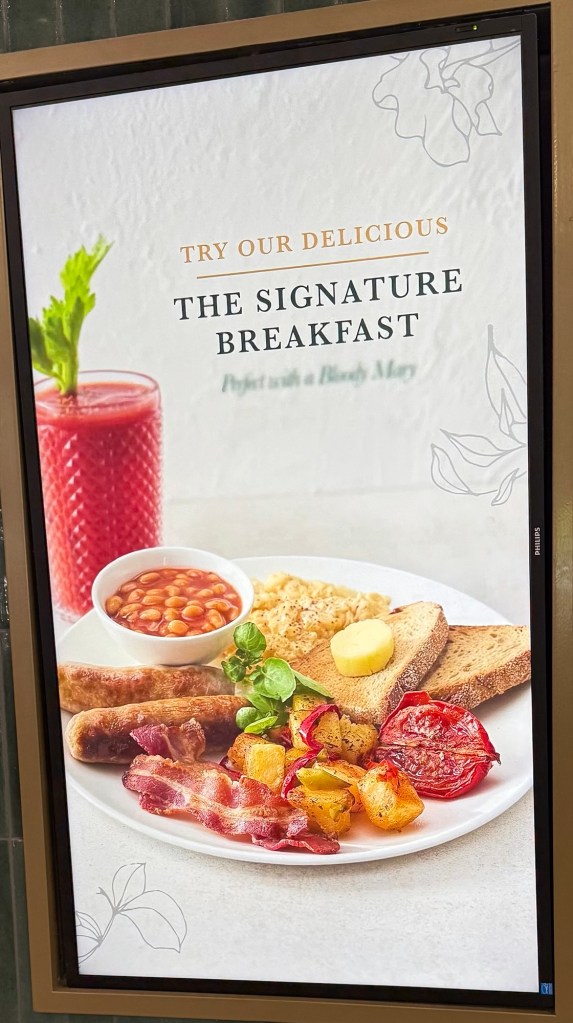 I’m just here gawking with happiness actually because I DID follow instructions and I DID get through the whole laborious procedure with scant delays. So now to breakfast. I used to wonder why everyone posts pictures of a pint ‘because it would be rude not to’ After ordering the ‘Breakfast’ I can understand why. Undercooked sausages that had never been turned for as long as the lighter they were grilled above was on, beans that should be left on Aldis ‘whoopsie’ shelf (if they had one). A lonely halved tomato that fried too as soon as it was hacked open with the wooden knife you’re given. Scrambled eggs that wouldn’t look out of place at a McDonald’s. Some sort of green pepper hash (I always thought hash browns were meant to be crispy) sour dough bread that could have actually been sour (not butter in sight) a pile of greenery that was cast aside and the crowning glory… the most anemic bacon from the roughest part of the pig they could find. All for the princely some of twenty of our best pounds sterling. (And you don’t even get a cup of tea) THATS why I think folk drink before six in the morning at the airport.